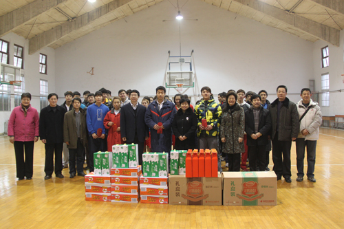 2012年1月18日下午,校党委副书记王凌、副校长刘志军,在党委宣传部、党委学工部、校团委有关负责人的陪同下来到篮球训练馆,亲切看望正在训练的运动员同学们,给大家送去了慰问品、慰问金,并致以新春的祝福。