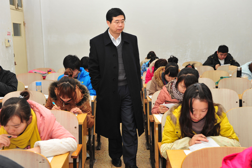 元月2日一早,刘志军在教务处负责同志的陪同下,来到明伦校区综合教学楼,现场查看考试进展情况,并与巡视及工作人员进行了深入交流,认真询问并查看了考场分布、考试科目、考场清场、随机编号、试卷规范等方面的情况,同时要求教务处等各有关部门切实负起责任,进一步加强管理,严肃考纪,注重细节,相互协作,确保考试工作顺利进行。