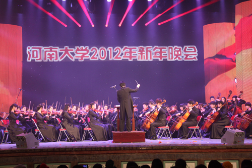 随后,筹建两年多的我校交响乐团第一次正式亮相舞台, 乐团70余名师生激情演奏了经典交响乐《红旗颂》和由我校著名校友、音乐家马可先生作曲的《白毛女》组曲。作品气势恢弘、高雅和谐,优美的旋律传递出新年的美好祝福,昭示着2012年河南大学开拓奋进、加快发展的美好愿景。