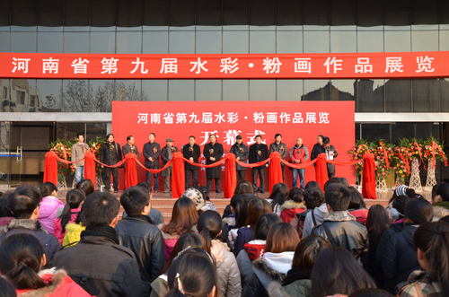 12月16日下午,由河南省美术家协会主办,河南省美术家协会水彩粉画艺委会,河南大学艺术学院承办的河南省第九届水彩粉画展开幕式在我校艺术学院隆重举行。河南省文联主席、省美协主席马国强,河南大学常务副校长赵国祥,河南省美术家协会副主席兼秘书长刘杰,河南省水彩粉画艺术委员会秘书长焦书晖及我省水彩粉画界的老前辈和兄弟院系领导专家出席了开幕式并剪彩。开幕式由艺术学院院长、省书法家协会副主席赵振乾主持。