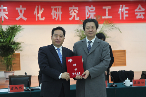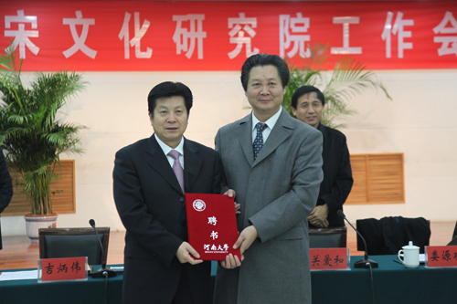 校长娄源功为开封市市委书记祁金立、市长吉炳伟颁发了河南大学兼职教授聘书。作为宋文化研究院院长,吉炳伟为研究院高级顾问、研究员颁发了聘任证书。受聘的专家学者围绕宋文化的研究与宣传、提升宋文化的社会辐射力、推动宋文化品牌走向世界等方面的问题进行了座谈交流。