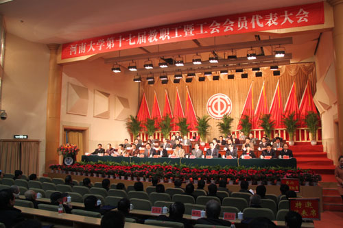在发展面临重大历史机遇,认真落实《国务院关于支持河南省加快建设中原经济区的指导意见》和省政府《百年名校河南大学振兴计划》提出的目标任务,满怀信心加快高水平大学建设之际,2011年11月26日上午,河南大学第十七届教职工暨工会会员代表大会在音乐厅隆重开幕。河南省教育工会主席李新江,开封市总工会主席陶书杰,我校全体校领导出席会议。郑州大学、河南农业大学、河南工业大学、河南财经政法大学、河南科技大学、河南师范大学、河南理工大学、河南教育学院、河南商业高等专科学校、河南职业技术学院等省内兄弟院校代表应邀出席了本次大会。校党委副书记王凌主持开幕会议,并宣布河南大学第十七届教职工暨工会会员代表大会开幕。全体与会人员起立,共唱国歌。