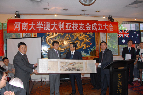 关爱和宣布河南大学澳大利亚校友会成立,同时宣布了澳洲河南大学校友会理事会及监事会组成,刘钢军担任会长。关爱和说,河南大学澳大利亚校友会的成立,不仅是海外校友的一件喜事,也是河南大学的一件大事。校友与母校有着特殊的学缘关系,校友对母校有着一份特殊的情感,而校友会则是联系海外校友与母校的重要桥梁与纽带。成立澳洲校友会,既是河南大学团结和凝聚海外校友的一项重要举措,也是河南大学加快国际化进程的重要途径。关爱和还向校友们介绍了学校近十年来的发展情况,就学校05年开始与中国科学院和中国社科院两院合作、06年学校明伦校区近代建筑群被列为国家重点文物保护单位、以及学校省部共建以来在学位点建设、百年名校河南大学振兴计划、郑州龙子湖校区建设、基金会成立等成就和事项上作了通报。就2011年9月29日,国务院下发了《关于支持河南省加快建设中原经济区的指导意见》,明确提出“支持河南大学创建国内一流大学”等内容向与会的澳洲校友们进行了讲解。大家倍受鼓舞。最后,关爱和代表学校欢迎各位校友回归母校参加百年校庆共襄盛典。