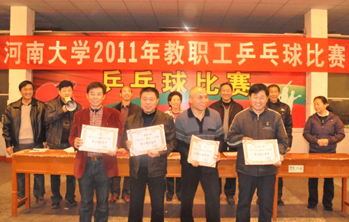 2011年11月7日晚,由校工会主办、体育学院、公共体育教研部共同承办的2011年教职工乒乓球比赛完美谢幕。校工会、体育学院、公共体育教研部相关负责人出席颁奖仪式,并为优胜团体及个人颁发获奖证书。
