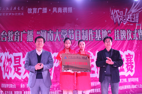 风尚让青春绽放,声音让梦想花开。11月4日晚,“你是女主播”风尚主播抢位赛首场海选暨河南电台教育广播“河南大学节目制作基地”揭牌仪式在我校科技馆一楼报告厅举行。我校党委副书记王凌,党委宣传部、团委、新闻与传播学院等相关单位负责人及河南电台副台李海军、教育广播负责人张建功出席活动。宣传部部长李文山和张建功共同为“河南大学节目制作基地”揭牌。