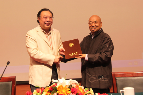 赵国祥代表学校欢迎刘向阳荣归母校。他表示,遍布海内外的广大校友对母校的大力支持,是我校发展的根本力量之一。刘向阳先生一直以来对母校念念不忘,多次以实际行动在母校发展的关键时刻不遗余力地给予支持,让我们深切体会到一位学子对母校的深沉情感。他对刘向阳能够回到母校为学弟学妹们传道、授业、解惑表示感谢,同时希望莘莘学子在求学过程中切实掌握知识技能,奠定坚实基础,将来建功立业,从而更好地弘扬河大精神,为母校增光添彩。刘向阳郑重地从赵国祥手中接过了聘书,并饱含深情地表示,再次成为河南大学的一员,是自己多年来最大的心愿,今天,这个梦终于得以实现。