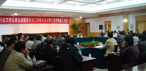 校党委书记关爱和作了《关于贯彻执行< 廉政准则>和党风廉政建设责任制情况的汇报》,从我校贯彻落实《廉政准则》和党风廉政建设责任制的总体情况以及存在的主要问题和今后的工作思路两个方面向督导组进行了工作汇报。关爱和说,我校党委和行政高度重视党风廉政建设工作,坚持把贯彻落实党风廉政建设责任制规定作为构建反腐倡廉责任体系的抓手,认真贯彻执行《廉政准则》等制度规定,切实保证上级关于党风廉政建设和反腐败工作部署和决策的贯彻执行,努力营造风清气正的校园氛围,为加快高水平大学建设进程、实现百年名校振兴提供有力保障。主要措施是:提高思想认识,强化反腐倡廉建设政治责任;加强廉政教育,营造风清气正的校园氛围;推进制度创新,从源头上预防和治理腐败;强化监督制约,规范权力结构和运行机制;坚持从严管理,教育引导干部廉洁自律;坚持标本兼治,坚决查办违纪违法案件。关爱和说,在全校上下的共同努力下,我校从实际出发,在贯彻落实《廉政准则》和党风廉政建设责任制方面取得了一定成绩。但是,我们也清醒地认识到,新的形势下高校党风廉政建设和反腐败工作面临着许多新问题、新情况,对照上级有关要求,我们的工作中还存在着一些薄弱环节和需要着力解决的问题,我们将高度重视,在今后的日常工作和反腐倡廉建设中认真加以克服。