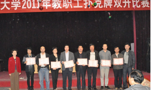 10月15日晚,我校教职工扑克牌双升比赛在明伦校区教职工活动中心落幕。校工会副主席娄素君、曹亚军出席颁奖典礼,并向优胜单位颁发获奖证书。 此次比赛共分为两个阶段。第一阶段为工会活动片组小组赛,六个活动片组每组决出前两名,12支队伍参加第二阶段比赛,角逐1—8名。 秉着公平、公正的原则,经过为期4天的鏖战,最终工商管理学院摘得桂冠,医学院名列第二,文学院位居第三,机关党委、艺术学院、保卫处、国际教育学院、基础实验教学中心则分别将4—8名收入囊中。