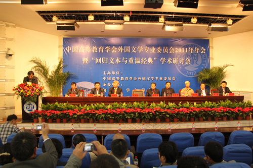 2011年10月15日上午,由中国高等教育学会外国文学专业委员会主办、河南大学文学院承办的中国高等教育学会外国文学专业委员会2011年年会暨“回归文本与重温经典”学术研讨会开幕式在我校明伦校区科技馆二楼举行。中国高等教育学会外国文学专业委员会会长杨正润,副会长刘建军、王立新,我校校党委书记关爱和等出席开幕式。开幕式由文学院教授梁工主持。