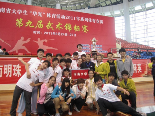 9月24日至27日,河南省第九届大学生武术锦标赛在信阳师范学院举行,这次比赛是河南省大学生“华光”体育活动2011年系列比赛之一,来自全省32所高等院校的选手参加了比赛。经过激烈的角逐,河南大学武术队以9枚金牌、11枚银牌、15枚铜牌,总分218分,以领先第二名100分的绝对优势夺得大学本科乙组团体总分第一名,并获得体育道德风尚奖。在男子乙组长拳项目比赛中,代表我校出战的7名队员包揽了前七名。