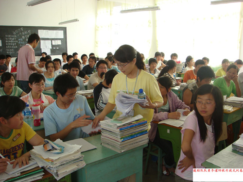 5月26日,小分队全面开展工作,针对地震发生后师生心理紧张、焦虑的状态,小分队主要通过以下五种方式工作:第一,所有的辅导老师进入各个班级,通过半结构式访谈问卷,了解学生中存在的各种心理问题;第二,开设临时心理咨询室,接待学生进行个别咨询;第三,每个班上一节心理辅导课,针对学生中最突出的心理问题做一个小型讨论,并体现出放松、同学之间的相互支持等含义。第四,由赵俊峰、王瑶老师给全体教师做讲座,题为“缓释压力,拥抱阳光”、“学习过程的心理疲劳及教育对策”。