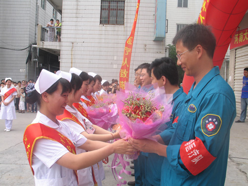 医护人员代表向队员们献上了象征荣誉的鲜花。在全场热烈的掌声中,队长李铁强代表医疗队作了总结发言,介绍了医疗队在灾区的行进路线和开展救治工作的基本情况。他说,在这次援川救灾过程中,河南大学医疗队全体队员以救治灾民为第一职责和最高使命,处处冲锋在前,克服重重困难,表现出了大无畏的牺牲精神,为河南省和河南大学争了光。李铁强同时表示,虽然由于医疗救护任务的调整,部分队员按照上级指示返回了学校,但灾区感人的事迹仍在激励着每一位队员,他们会在自己不同的岗位上更加努力地工作,用各种各样的方式继续支援灾区人民。