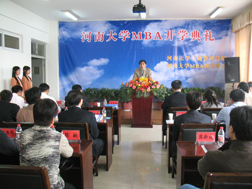 工商管理学院院长魏成龙阐述了河南大学的MBA教育发展思路,MBA学员代表朱建伟表达了自己对MBA教育学习的渴望与决心。