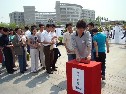 随后,全校共产党员走向募捐箱,为灾区捐献特殊党费,师生们也再次踊跃为灾区人民捐款。悼念仪式结束后,经统计此次活动收到特殊党费共计113306.3元,师生再次捐款共计12502.6元。