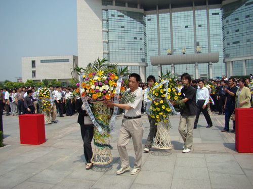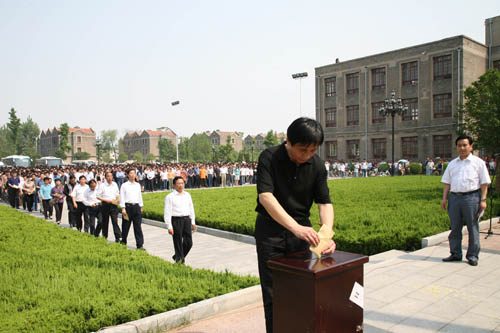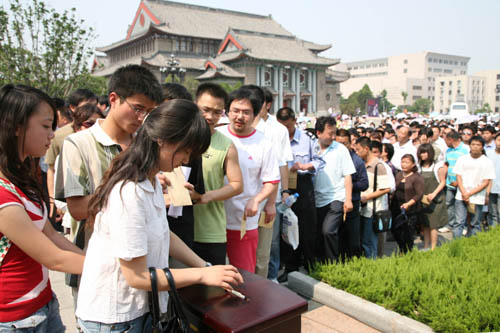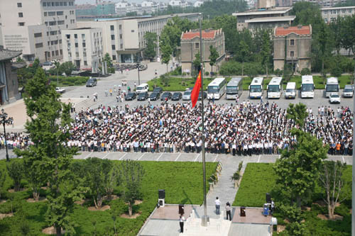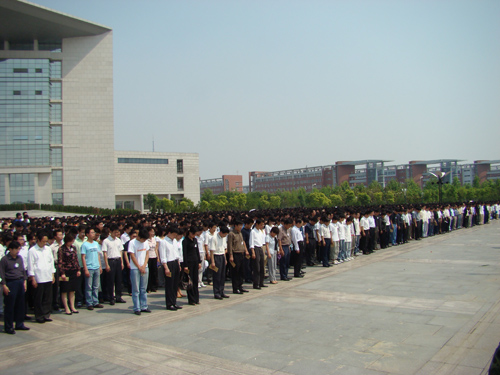 5月19日下午14时28分,我校师生同时在明伦校区和金明校区举行哀悼仪式,为四川省汶川大地震遇难同胞集体默哀三分钟。
