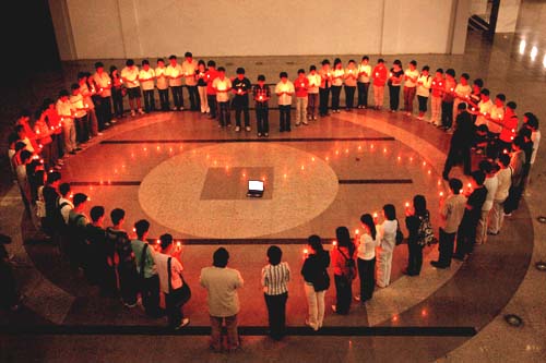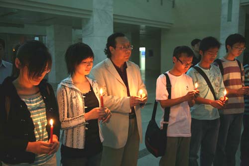 在《让世界充满爱》的乐曲中,赵国祥和各部门负责人与近百名同学共同点燃了红烛,为四川家乡的人们祈祷平安。蜡烛点亮了这个普通的夜晚,也温暖了这些学子的心,温暖了整个河大园!此外,艺术学院的王安军等同学还特意赶制了一首曲子《我们在一起》,表达了对灾区人民的慰问之情。
