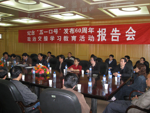 为纪念中共中央发布“五一口号”60周年和协助我校各民主党派组织深入开展“政治交接学习教育活动”,党委统战部于4月24日下午在新办公楼第一会议室举行报告会。党委统战部有关负责人与民革、民盟、民建、民进、农工、九三学社等各民主党派负责人及其成员代表30余人与会。报告会由姜捷副部长主持。