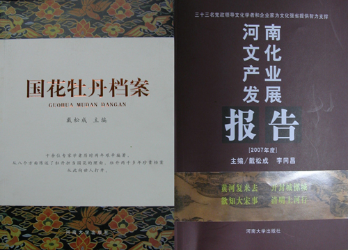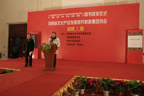 2008年元月26日,河南大学出版社与河南省文化产业发展研究院、河南省新华书店、“协商论坛”杂志社共同举办的《国花牡丹档案》和《河南文化产业发展报告》首发式在郑州市黄河迎宾馆会议中心中华大厅隆重举行。河南省政协副主席袁祖亮,省人大原副主任、省扶贫助残慈善总会会长张世军,省委宣传部副部长李庚香,河南大学出版社社长马小泉、总编辑张云鹏,河南省新华书店总经理周卫滨和近300位专家学者出席。首发式由省政协常务副秘书长马葆青主持。张云鹏,周卫滨、《河南文化产业发展报告》主编李同昌,《国花牡丹档案》主编戴松成、副主编王高潮等在首发式上致辞。