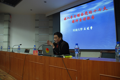 典礼结束后,河南省委学习领会十七大精神宣讲团成员、我校原副校长王发曾教授作了“深入学习领会党的十七大精神”的宣讲报告,从十七大的主要成果与重大意义、如何深入理解十七大主题、全面建设小康社会的主要任务和以十七大精神为动力开创中原崛起新局面四个方面为学员们讲授了团校第一课。