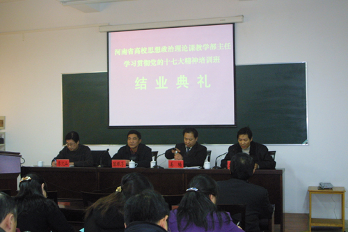12月5日下午,全省高校思想政治理论课教学部主任学习十七大精神培训班结业典礼在金明校区干训中心3楼报告厅举行。省委高校工委、教育厅社政处处长陈垠亭,副处长姜楠,我校党委宣传部部长李文山出席。典礼由姜楠同志主持。