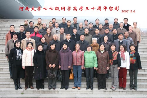1977年12月8日、9日,是取消了11年的高考恢复后的第一次全国考试,也就是30年前的12月8日,1100多名有志青年从严格的考试竞争中脱颖而出,成为当时还被称为开封师范学院的“天之骄子”,而今他们已经奋斗了30年,他们中的78位留校,如今组成了我校的核心力量,成为了教师队伍中的骨干和精英。