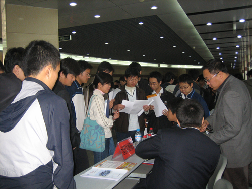 随后, 大连IT企业代表团的七家用人单位,包括大连华信计算机技术股份有限公司、大连思派电子有限公司、大连信雅达软件有限公司、大连软件园信息系统有限公司、大连远东数码有限公司、海辉软件(国际)集团公司、大连晟峰中天软件有限公司,在一楼大厅进行了现场招聘。400余名毕业生参加了本次招聘会。