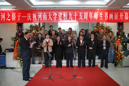 10月29日上午,我校在河南省文联举行了庆祝我校建校95周年师生书画精品展的开幕仪式,省政协主席王全书亲自书写了“河之骄子”主题词。原省委宣传部常务副部长葛纪谦、省文联党组书记吴长忠、省文联主席马国强、省人民银行行长计承江、原省文联副主席王鸿玉、省书协主席宋华平、教育厅学生处处长石品、教育厅体卫艺术处处长郭蔚蔚、省书画院院长李运江和我校校领导张秉义、孟庆琦等参加。孟庆琦同志主持了开幕式。