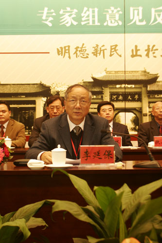 考察意见宣读完毕后,李延保教授还发表了热情洋溢的讲话。他说,几天来,从我所接触的学校领导、老师和同学身上充分感悟到河南大学这所百年老校的历史底蕴和新时期河大人的风采。河南大学见证了中国历史传统科举制度的终结和现代意义大学的开始,也经历了中国高等教育近百年的风雨变迁,数易校名,历经坎坷,但河大的文化传统始终得以继承,河大人的精神品质锤炼成河大人特有的“铁塔”品格。在河大的几天,我们在反复体味学校的人文精神和河大人的“铁塔”品格,感到河大人憋着一股劲,就是要抓住一切机遇,重振河大历史雄风。河南大学曾经是我国历史上最早的几所国家综合大学之一,培养了几十万名优秀学子,派生出一批新的大学,在不少大学中也流淌着河大的血液,河南大学为中国的高等教育事业曾经做出了重大贡献。正是这个历史培植了河大人“百折不挠、自强不息”的精神。今天,河大蓄势待发,省委省政府高度重视学校发展,明确了学校发展的历史定位,要把河大建成全国一流大学。这不仅是河大人的梦想,更是河大人的历史追求,也是河南这个中国人口第一大省,中华黄河文明的发源地,即将崛起的中原大省对高等教育发展的需要。这次本科教学工作水平评估,学校高度重视,全校师生员工共同努力,通过扎实的评建工作已经打造了一个更加完善的人才培养平台。学校要以此为契机,进一步明确学科、专业发展和深化教育教学改革的目标,要找准学科发展的生长点和教育教学改革的切入点,要以国家与区域经济、社会发展为出发点,提高科技服务能力和人才培养质量的标准,在服务社会中提升学校办学水平和综合实力,实现学校和各相关学科、专业的新的更高的定位。通过这次评估,要用更高的要求,更开拓的视野,狠抓内涵发展和质量水平的提高,以河大人特有的“铁塔”品格,创造条件,争取未来更大的发展机遇,实现河大人的理想追求,努力跻身全国一流大学行列。这也是我作为高校同行的衷心祝愿。李延保教授讲话期间,报告厅内爆发出一阵阵经久不息的掌声。