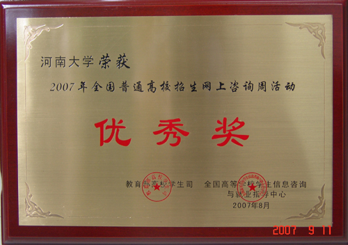 日前,教育部发布教学司【2007】17号文,对2007年全国普通高校招生网上咨询周活动表现突出的单位进行了表彰。在全国1600多家高校中,有50所高校被表彰,我校位列其中,并荣获优秀奖。这是我校教务处、招生办继去年荣膺“河南省招生先进单位”的称号后,获得的又一省级以上荣誉。