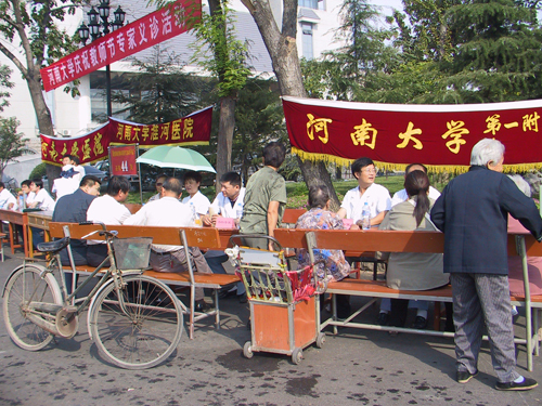 9月7日上午8:00整,新行政楼东南侧的广场内就已来了许多等候咨询的教师,校医院的十多位专家在医院院长李保印、副院长徐自立、工会主席白旭光带领下开始工作。东京医院工会主席谷卅阳、淮河医院工会副主席梁留安也分别带领各自专家组前来参加义诊。由三十余名专家组成的医疗检查队伍共分设血压测量、外科、内科、妇科、口腔科、心脏内科及中医咨询等多个项目,为教职工的健康状况作最为详尽的诊断。当日共为二百余人测量了血压,近六百名教职工接受了专家们的检查和诊治。