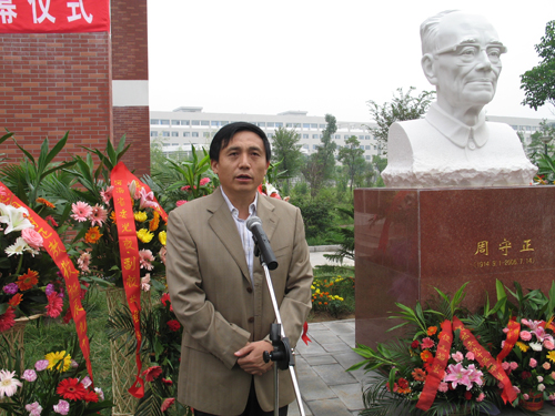 王耀同志发表讲话。他说,作为一名教育家和著名学者,周守正教授给后人留下了很多宝贵的财富。他认为周守正教授塑像的落成具有三方面的意义,一是铭记一个时代,以周守正教授为代表的一代教育工作者如何教书育人;二是弘扬一种精神,即老一代学人精心治学、锲而不舍的精神;三是凝聚一种人气,河南大学的师生在周守正教授精神的激励下,必将为河南教育事业的发展做出更大的贡献。