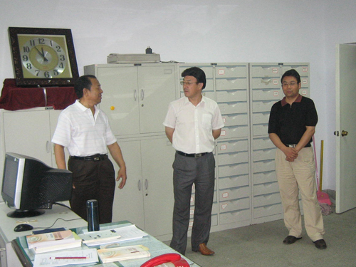 郑邦山同志在马列德育部党政班子的陪同下走访了各个教研室,对坚守在评建工作第一线的教职工表示亲切慰问;并参观了评建办公室、试卷库和资料室,对老师们负责端正的评阅态度和试卷库的建设表示满意。