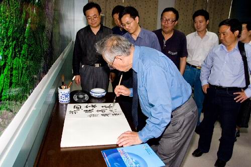 在校史馆,当讲解员讲到省立国立时期的河南大学时,许靖华先生看到父亲许心武的照片激动不已,他说,父亲是一个正直的人,我对他很是敬仰。看着一幅幅珍贵的历史照片和实物,许先生不时向讲解员询问其中的细节与故事。按耐不住激动的情绪,许靖华先生题下了“回家我很高兴”六个大字来表达回校的心情。