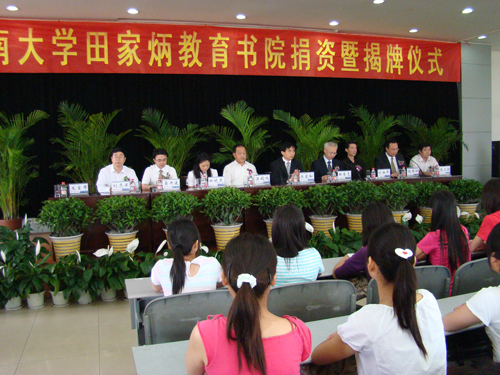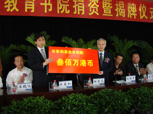 为了促进我校教育学科的发展,香港田氏化工有限公司董事长、田家炳基金会董事会主席田家炳先生捐资300万元港币,在我校建立田家炳教育书院。2008年5月21日上午,田家炳教育书院捐资暨授牌仪式在教育科学学院一楼报告厅举行。香港田氏化工有限公司副总经理、田家炳基金会董事长、田家炳先生之子田荣先,田荣先之女田晓岚,田家炳基金会顾问汪鹤鸣、干事萧开廷,河南省教育厅副巡视员刘湘平、科研外事处副处长张水潮,校长关爱和,教育科学学院相关负责人出席仪式。仪式由副校长赵国祥主持。