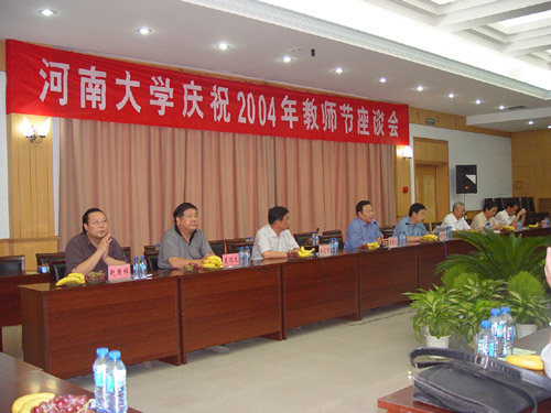 2004年9月9日下午3时30分,我校在新行政楼第四会议室召开河南大学庆祝2004年教师节座谈会,在校工作的院士、省特聘教授、黄河学者、校特聘教授、优秀学术群体牵头人及成员代表和机关有关部门的负责人与会,校领导张秉义、赵豫林、王发曾、赵振海、袁顺友、史全生、黄亚彬、赵国祥出席。会议由校党委书记张秉义同志主持,张秉义同志代表学校党委、行政向各位教师致以节日的祝贺,向一年来为学校建设和发展作出贡献的全体教职工致以崇高的敬意。