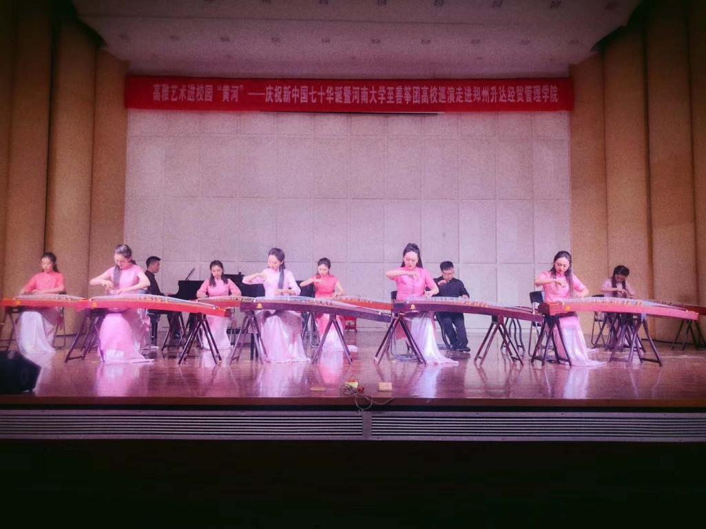 为推动民族音乐走进社会、走进大众、走进校园,促进文化艺术水平更好发展,5月16日,2019年河南省高雅艺术进校园暨河南大学至善筝团庆祝建国70周年高校巡演第二站在郑州升达经贸管理学院举行。我校音乐学院、郑州升达经贸管理学院艺术学院相关领导出席活动。