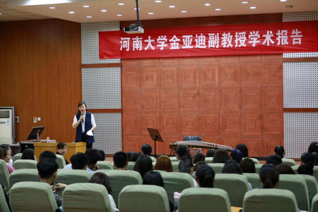 当日下午,金亚迪还受邀做了学术讲座。讲座围绕“古筝演奏中的技巧运用与情感把握”主题展开,并以陕西筝曲《秦土情》为例进行讲解。金亚迪结合现场同学演奏中所出现的问题,从技法运用,呼吸的运用、情感的把握几个方面向大家详细讲解了古筝学习及演奏中的要点,重点讲述了摇指、压弦等技法的运用。