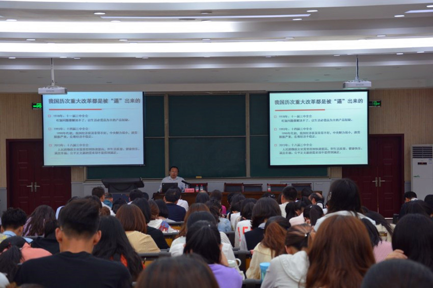 5月16日下午,为深入学习贯彻习近平新时代中国特色社会主义思想,引导师生用习近平新时代中国特色社会主义思想武装头脑、指导实践,数学与统计学院邀请经济学院教授李保民在南阶梯教室作“习近平总书记论全面深化改革”专题报告,学院领导班子成员、全体师生党员和部分入党积极分子参加报告会。