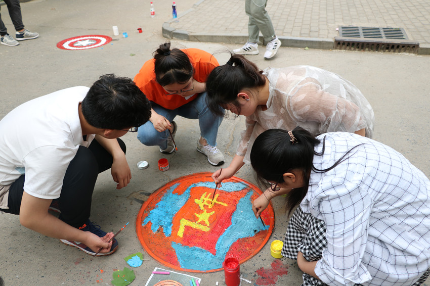 下午2点30分,活动正式开始。正所谓“其所以神化而超出于众表者,殆犹天马行空而步骤不凡”,参与活动的同学们自由畅想,尽情发挥,将天马行空的灵感和对国家的热爱通过一个个鲜明独特的彩绘作品展现出来,为古色古香的校园增添了青春的气息。博雅路上,原本布满锈迹的井盖在同学们的笔下摇身一变,成为一幅幅展示中国发展的图卷;三观园内,老师们拿着画笔一笔一划地细细勾勒图案轮廓,他们时而停笔欣赏,时而与同行学生交流讨论,现场欢笑不断。