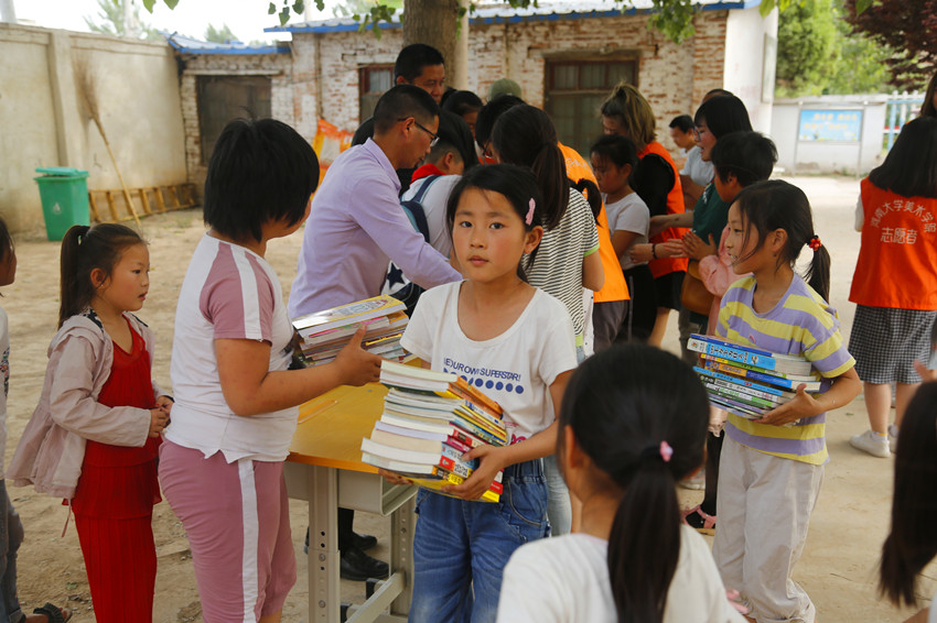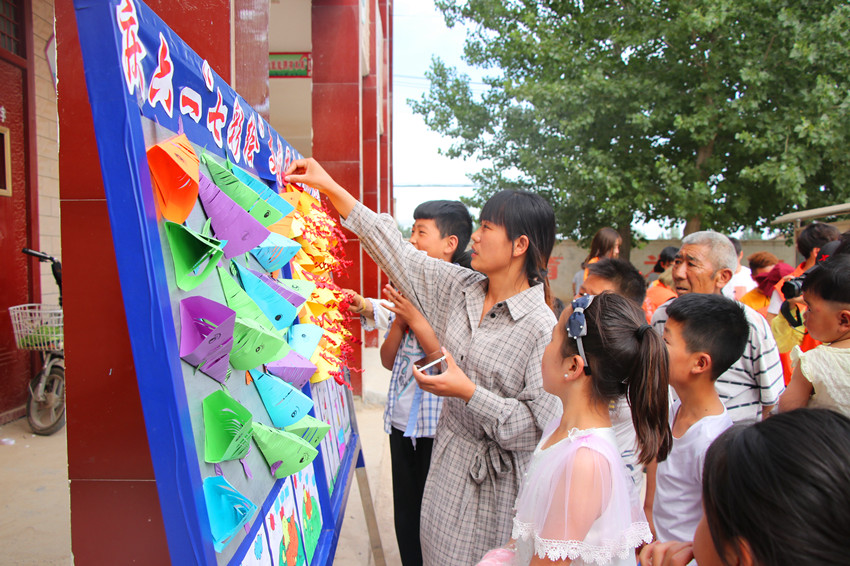 下午两点,“七彩绘”志愿者经过一个多小时的车程赶到杜良乡大康寨小学,为小学六个年级的一百多位在校生开展了一堂美术课程,课堂以折纸、手工、简笔画、硬笔书法等多种形式开展,深受乡村小学生的喜爱。下课后,志愿者们将课堂上的教学作品布置成了三块以“大康寨小学‘庆六一’七彩绘支教团美术作品展”为主题的展板,作为大康寨小学的“庆六一”系列活动之一,将在校园里进行为期一周的展示。随后,七彩绘志愿者将前期在河南大学校园内募捐到的588册课外图书,在“哆啦A梦”图书室前举行了赠书仪式。