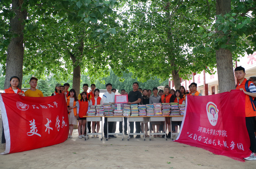 河南大学“七彩绘”文化艺术服务团成立于2016年,由美术学院团委直接指导,依托美术学院青年志愿者协会开展日常志愿活动。自2016年始,已有累计近千名志愿者参与此项志愿服务活动中,已经先后走进六个贫困村绘制了二百余幅共一千余平方米主题墙绘,连续三年每周送艺术课堂到两所乡村小学、连续三年到走进开封市社区、周边贫困村开展政策普及宣讲,为空巢老人留住青春岁月百人计划也已正式启动。旨在引导美术专业大学生在艺术实践中学习弘扬践行社会主义核心价值观,关爱农村留守老人儿童、填补基础教育艺术课堂空白、助力贫困乡村脱贫工作。