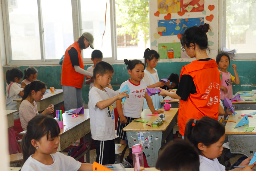 为深入贯彻落实习近平在纪念五四运动100周年大会上的重要讲话精神,彰显河南大学美术学院专业特色,强化在校大学生专业实践能力,培养其服务社会、服务人民的思想意识,做好文化传承和美育育人工作,5月23日,河南大学七彩绘文化艺术服务团再次来到杜良乡大康寨小学开展志愿服务活动。二十多位“七彩绘”志愿者,为大康寨小学一百多位在校生同上一堂美术课,并组织了“大康寨小学‘庆六一’七彩绘支教团美术作品展”,同时带来了588册募捐图书,捐赠给2016年“七彩绘”志愿者在杜良乡大康寨小学设立的“哆啦A梦”图书室。