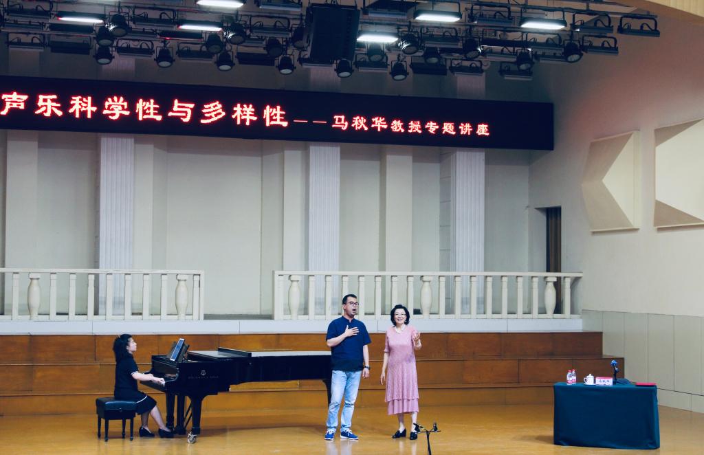 讲座中,马秋华教授就中国声乐科学性与多样性进行了讲解,从延安时期讲到了新中国时期,又从中国电影音乐盛行的上世纪七十年代讲到了改革开放多年后的今天,以一个一个生动鲜活的例子讲述了中国声乐科学性与多样性的结合。讲座后,马秋华还对音乐学院的6位中青年骨干老师进行了现场教学与指导。马秋华的授课生动形象,针对老师们的演唱,给出了宝贵的意见和建议。学院师生与兄弟院校的师生们从讲座中受益匪浅。