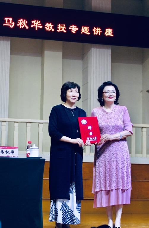 当天下午,在师生热烈掌声中,马秋华走上音乐学院音乐厅讲台,为大家做了题为《中国声乐科学性与多样性》的学术讲座。讲座开始前,音乐学院院长王思琦在致辞中对马秋华教授到来表示热烈欢迎。沈洁霞为马秋华颁发了河南大学客座教授聘书。