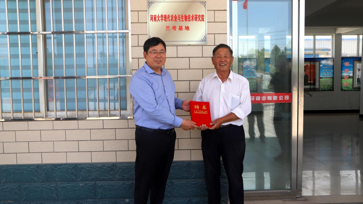 河南天民种业有限公司董事长、著名小麦育种专家沈天民为大家介绍了公司的有关情况。赵东保、沈天民及兰考县科工信局副局长杨龙共同为河南大学现代农业与生物技术研究院兰考基地揭牌,赵东保向沈天民先生颁发了河南大学生命科学学院校外实习指导教师聘书。仪式结束以后,沈天民董事长带领大家参观了公司远缘杂交小麦育种基地和国家超级小麦育种基地,并详细介绍了与河南大学合作培育的多个优良小麦新品系和新品种申报参试情况。赵东保感谢公司多年来对河南大学生命科学学院的支持,表示会继续鼓励和支持学院有关科研人员开展小麦育种研究,双方就进一步加强合作进行了深入广泛的交流。