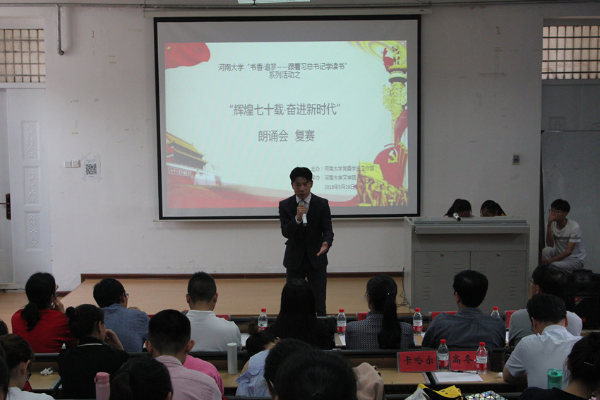 5月26日下午,由党委学生工作部主办、文学院承办的河南大学“书香•追梦——跟着习总书记学读书”系列活动之“辉煌七十载•奋进新时代”朗诵会复赛在文学院二楼大教室举行。