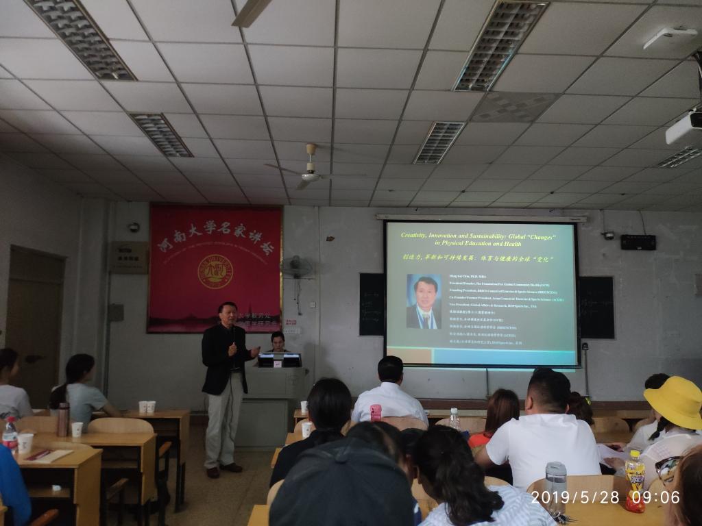 5月28日上午,全球健康社区基金会 (GCH)创始会长钱铭佳教授在综合楼209教室作了题为“Creativity, Innovation and Sustainability: Global ‘Changes’ in Physical Education and Health”的学术报告。体育学院研究生本科生及部分教职工听取了报告,报告由体育学院院长张大超主持。