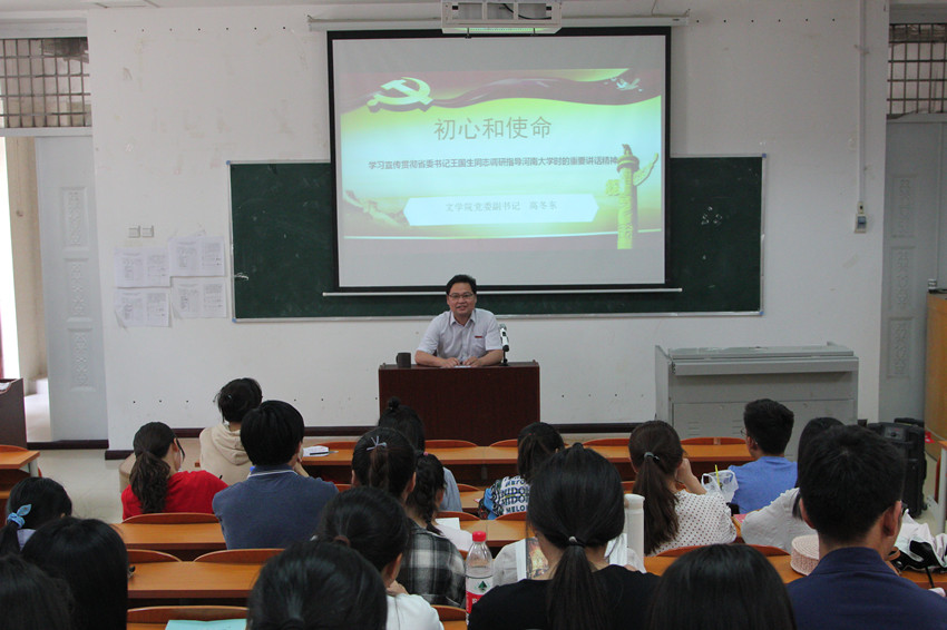 5月30日下午,文学院党委副书记高冬东在学院一楼大教室为青马班暨团校学员上团课,团课以“初心与使命”为主题,学习省委书记王国生同志来校调研指导工作时的重要讲话精神。