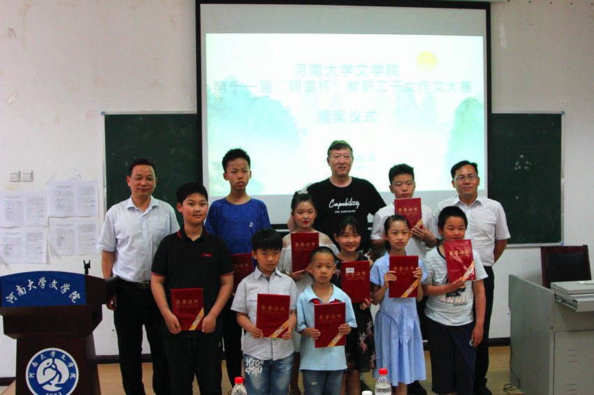 6月1日下午,文学院第十一届“明星杯”教职工子女作文大赛颁奖仪式在学院一楼大教室举行。文学院党委书记、关工委主任葛本成,常务副院长王宏林等相关负责人出席。活动由文学院党委副书记、工会主席高冬东主持。