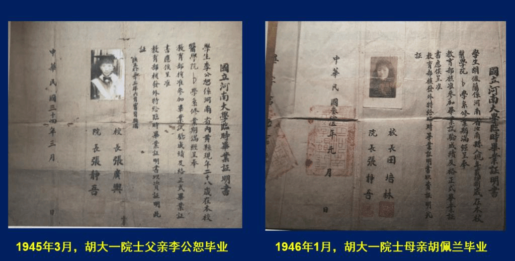胡大一院士母亲胡佩兰和父亲李公恕皆为河南大学医学院知名校友。